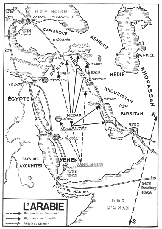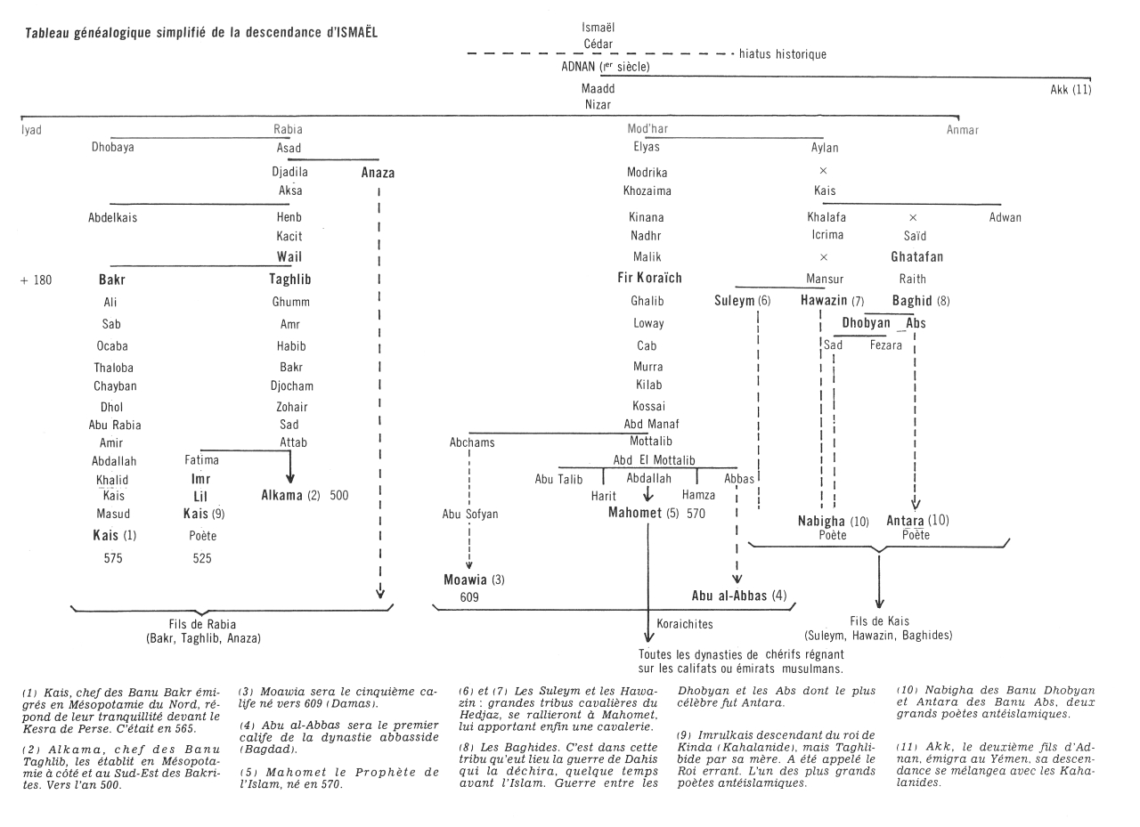 cette pensée que le monde doit devenir musulman, est une pensée d'Omar. ERNEST RENAN « Mahomet et les origines de l'Islamisme » Associé au mot cheval, il signifie : le cheval des Arabes Ecrit en phonétique Arab, il signifie le cheval de race par opposition aux autres chevaux ! Histoire de la descendance d'Ismaël Le lecteur a sans doute compris notre méthode qui est de rechercher le cheval arabe dans l'histoire du peuple arabe, sans lequel il n'existerait pas. En effet, comme nous l'avons dit plus haut, comme nous le verrons plus loin, sans l'homme le cheval du désert n'aurait jamais existé. Aussi bien le lecteur comprendra que nous devons maintenant étudier la descendance d'Ismaël, dans laquelle toute la Nation arabe se reconnaît de nos jours. D'après les croyances musulmanes, la vallée de La Mecque aurait été le berceau de la race arabe ismaélite. C. de Perceval écrit: « Cette idée me semble avoir quelque chose de juste, si on la restreint à la portion de cette race qui s'est perpétuée jusqu'à nos jours, à la nation issue d'Adnan, descendant éloigné d'Ismaël. Quant aux générations ismaélites plus anciennes, l'Ecriture sainte nous les montre se développant dans les déserts situés au nord de l'Arabie [péninsulaire]... » Abraham, sur l'ordre de Dieu, emmena son fils Ismaël, et Agar l'Égyptienne, sa mère, en Arabie dans le désert où plus tard La Mecque fut édifiée. Ismaël y fit jaillir la source de Zemzem. Il épousa d'abord une fille des Amalika, qu'il répudia, puis une fille des Djohorn. Il eut d'elle les enfants qui perpétuèrent sa race : Nabayoth, Cédar, Adbeel, Mabsam, Masma, Duma, Massa, Hadad, Thema, Jethur, Naphis, Cedma. Abraham, revenu voir son fils, construisit avec lui le temple (de La Mecque), qu'ils dédièrent au Seigneur et à l'ange Gabriel. Abraham dit alors : « Ma tâche est terminée, je pars et je te confie tout ce pays et ce temple dont Dieu te constitue le Gardien. » Ismaël mourut à plus de cent trente ans. Perceval écrit : « ... une immense lacune est ouverte ici dans la suite généalogique des enfants d'Ismaël... Le premier rejeton de la tige d'Ismaël que l'on connaisse... est Adnan... de la branche de Cédar. » Mais la descendance d'Ismaël a cependant, durant cette période obscure, une histoire bien réelle, puisque de loin en loin la Bible nous en parle. Un demi-siècle après la mort d'Ismaël nous les voyons caravaniers chameliers, dans la Genèse (Vente de Joseph, XXXVII). Cinq siècles plus tard, associés aux Madianites et aux Amalécites, ils combattent les Israélites (Juges, VI, VII, VIII). Ce sont « tous les fils d'Orient » qui pillaient Israël. « Ils ne laissaient en Israël aucun ravitaillement, ni brebis, ni boeufs, ni ânes... Innombrables étaient-ils, ainsi que leurs chameaux. » (Juges, VI, IV, v). Gédéon les vaincra. Il dit aux Israélites : « J'ai une demande à vous faire: que chacun de vous me donne les anneaux de son butin » [...] car « ... les ennemis, qui étaient ismaélites, portaient des anneaux d'or. » (Juges, VIII, XXIV.) Il y en eut pour mille sept cents sicles d'or ! Preuve de la richesse des marchands ismaélites, ancêtres des Koraïchites, la tribu de Mahomet. Preuve aussi que les Arabes faisaient déjà un grand commerce caravanier qui les conduisait dans toutes les régions du Proche-Orient. Et cependant, à cette époque, les textes sacrés ne les décrivent jamais avec des chevaux. La société arabe n'était pas parvenue au degré d'évolution qui plus tard lui fera rechercher le cheval. Cinq siècles se passent et nous les retrouvons avec Isaïe proférant des menaces contre les fils de Cédar, vaillants archers (Isaïe, « Oracle des Steppes », XXI, XIII). La prédiction se réalise après un siècle. Holopherne, général babylonien, dévaste le pays des descendants d'Ismaël et les déporte en Mésopotamie (Judith, II, VII, XIII). Jérémie, plus tard encore, appelle à la destruction des fils de Cédar (Jérémie, XLIX, XXVIII) Debout ! Marchez contre Cédar Anéantissez les fils de l'Orient Qu'on prenne... leurs troupeaux Qu'on enlève... leurs chameaux .................................. Que ses chameaux soient votre proie Et ses nombreux troupeaux votre butin. C'était au VIIe siècle avant notre ère. Les fils de Cédar étaient déjà parfaitement décrits comme des pasteurs nomades chameliers. C'est ce que nous confirme Ézéchiel (« Chant funèbre sur la chute de Tyr », XXVII), nous décrivant Tyr commerçant avec le monde entier : « Les gens de Thogorma (Arménie) te soldaient en chevaux de trait, chevaux de selle et mulets. » (Verset XIV) « L'Arabie et tous les princes de Cédar trafiquaient avec toi pour des moutons, des béliers et des boucs. » (Verset XXI) « Les marchands de Saba [Yémen]... te payaient en aromates... en gemmes... et en or. » On le voit, la descendance d'Ismaël avait proliféré en Arabie comme pasteurs et marchands. Jamais la Bible ne nous les présente comme éleveurs de chevaux. [Tableau généalogique simplifié de la descendance d'Ismaël] Après Ézéchiel, l'Ancien Testament se tait au sujet des Arabes. C'est alors la tradition arabe qui prend le relais. Mais nous constatons un hiatus de quelques siècles entre ces deux traditions. Il eût été étonnant qu'elles concordassent exactement. Cela aurait senti le trucage ! Il n'en est rien, et en fait l'origine ismaélite d'Adnan, l'ancêtre commun, n'est contestée par personne. « Les Arabes du Hedjaz et du Nedjd, enfants d'Adnan par Maadd, ont toujours regardé Ismaël comme leur auteur... », « ... Mahomet, qui se faisait gloire de son origine Ismaélite, n'a jamais été contredit sur ce point par les Juifs, ses ennemis. » Les fils de Nizar. Maadd, fils d'Adnan, eut plusieurs fils dont Nizar. Celui-ci fut le père des principales tribus du Hedjaz et du Nedjd. Il eut quatre fils : Iyad, Rabia, Modhar et Anmar. Dans les ouvrages de la littérature arabe, i