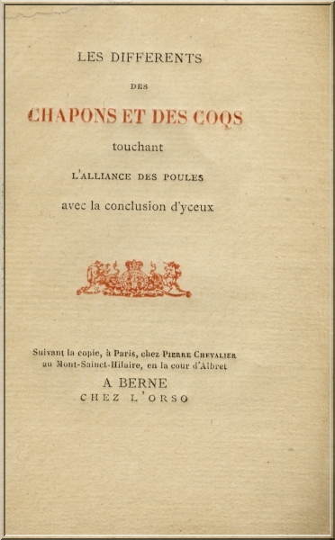 Jadis, quand les bestes parloient, les unes se contentoient de leur sexe, et les autres, se faschoient des retranchements du leur. Les Chapons, à quy de jeunesse on avoit coupé la crette, soit ou pour rendre leur voix plus fine et delicatte, ou pour les rendre plus seurs gardiens des poulles, poussez de quelque reste de leur premice nature, ou sollicitez des imitations des Coqs, voulurent faire alliance avec les Poulles ; mais, comme ordinairement nous sommes plustost conduits, de l’œil de nostre contentement que de celuy de nostre proffit, les Poulles, qui les voyoient sans crette, faisant fort peu d'estime de leurs belles plumes, ne vouloient de leur association. Les unes, plus scrupuleuses des tesmoings (1) à leur alliance ; les autres, moins subtilisées, se contentoient de la parade ; toutefois le temps, quy nous faict desdaigner une mesme viande et apprendre des nouvelles fausses, faict souvent naistre des repentirs à celles quy ne voyoient point croistre la creste à leur allié, et que veritablement et d’effect elles mangoient du poisson sans sauce. Ce repentir engendre des regrets, ces regrets engendrent dess plaintes, et ces plaintes engendrent des controverses. Mais, comme elles en estoient en les ces termes, les Chapons eurent quelque divorce avec les Coqs, touchant la primauté. Les Coqs, fondez en bonnes raisons, demandoient la preeminence, et less Chapons, orgueilliz de quelque vanité, ne vouloient estre seconds qu'à eux-mesmes. Il vindrent premierement aux reproches, et puis aux coups ; mais les Coqs, comme en mespris des Chapons faisoient monstre de leurs crestes,, disant que cela leur devoit faire bonne honte et peur tout ensemble. Les Chapons, se sentant chatouillez de si près, commencèrent à drapper les Coqs, disant que ce qu'ils jugeaient l'ornement de leurs testes estoit la defformité de leur sexe, et qu'on leur en avoit faict une synderèze (2) pour embellir cette laideur, et qu ils en estoient mieux venuz auprès des Poulles, leurs becs estans moins rudes. Les Coqs, en contr'echange, les voulant toucher au vif, amenèrent les Poulles en tesmoignage pour decider cette querelle. Les plus novices remirent cela au conseil des plus experimentées, tant pour s'instruire de chose qu'importe leur felicité que pour n’estre deceues à l'election de l'un eu l'autre party. Les Coqs, resolus à leur accusation, et les Chapons à leurs defences, receurent volontairement les Poulles pour arbitre de leur cause. Les Chapons en avoient une pour leur advocate quy avoit assez de babie, mais trop peu de constance pour maintenir leur cause bonne ; les coqs en avoient une quy alleguoit tant d’experience pour preuve qu'elle confondoit les bastardes raisons des Chapons, disant qu'elle aimeroit autant estre associée à une Poulle, que ses beccades auroient autant de suc, et que, la creste leur manquant, ils avoient quelque autre chose de manque quy servoit de joyau à la feste, et qu elle estoit deliberée, selon sa coustume, de couver au moins une fois l’an, et qu’elle vouloit un Coq ,quy put servir de targue (3) à ses poussins et resister aux ruyneuses escarmouches du mylan ; et qu'elles avoient prins telle habitude d'estre esveillées trois fois la nuicts des chants de son Coq, qu'à peine pourroit-elle dormir si ou sept nuicts entières auprès d'un Chapon quy ne chantoit que peu souvent, encore avec si peu d’harmonie qu'il donnoit plustot de la fascherie que du contentement ; et que le matin le Coq relevoit sa creste comme plein de courage et d’envie de continuer tel resveil, où le Chapon, les aisles baissées, tesmoingnoit sa pusillanimité ; enfin, que les Chapons ne sont bons qu'à commencer une alliance où les Coqs la peuvent achever par effect. L'advocate des Chapons alleguoit quelques subterfuges, non tant pour preuve de sa cause que pour preuve de sa suffisance. Toutes ces echappatoires ne peuvent renverser le droict des Coqs, car elle-mesme, rangée à la raison, tourne sa casaque, et, recognoissant l'injustice, les invite à quelque appointement par des propos desguysez, desquels elle en sçavoit assez. Si les Chapons ne chantoyent que peu souvent, cela leur apportait du repos, et que, les Coqs, au contraire, par mauvaise habitude, inquietoyent leur tranquillité, et que c’estoit des allarmes plus convenables à la guerre qu'en la paix ; et si le matin ils n'estoyent si rodomonds, cela tesmoingnoit leur bonté naturelle de ne faire aux poulles non plus que les poulles à eux, et que, si elles ne couvoyent, qu’elles n’estoyent assujetties aussy de chercher la nourriture à une suite de poulets quy leur rongnoient les ongles de si près qu'à peine pouvoient-elles gratter, et outre tout cela, n'en faisant point esclore , elles n'en voyoient point ravir. Ces discours avoient quelque apparence d’aimer les Chapons ; mais, quant à l'intention, elle passoit au party des Coqs. Comme, à la vérité, elle sçavoit bien que les resveils des Coqs ne se faisoyent qu'à leur advantage et pour les faire aprèsdormir de meilleur courage, et qu'elles ne pouvoyent couver qu'elles ne receussent pour une heure de mal un siècle de contentement, et qu'après un certain temps les poulets cherchoyent leur vie eux-mesmes, puis leur en faisoient part, que cela leur apportera plus de commodité que de fascherie ; au reste, que telles allarmes n’estoyent jamais sanglantes ; que la guerre en estoit plus desirable, pour estre plus tost d’amytié que de hayne. Tout enfin debatu, les Coqs payent les espices, et les Chapons condamnez par arretz incapables de l'alliance des poulles ; et si quelqu'un trop outrecuidement les acostoit, qu'il faudroit qu'il amenast deux tesmoings au jeu quy fussent valables et suffisants, voire d'aage competant ; que les poulles ny les poulets n'y seroyent pas receuz pour juges, ains seullement les Coqs les plus experimentés ; et si quelqu'un se laisse corrompre par grain ou autre moyen, seroit condamné à une amende arbitraire. Le