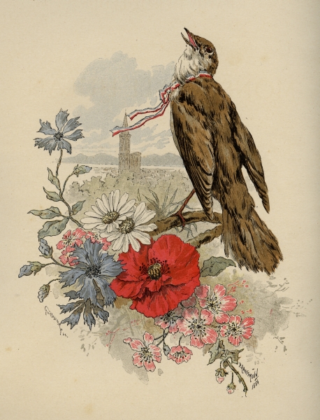 Ce que l'oiselet dit en son langage : Ceci se passait dans un bon village Peut-être alsacien, peut-être lorrain, Tous les deux peut-être, en tout cas je gage, Près de la Moselle et non loin du Rhin. III