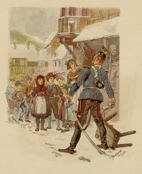 Les petits souliers près des gros chenets Renfermaient chacun un noeud tricolore. Et tous les bambins d'une voix sonore : « O chères couleurs, je vous reconnais ! » Et voilà les noeuds piqués aux bonnets. VII