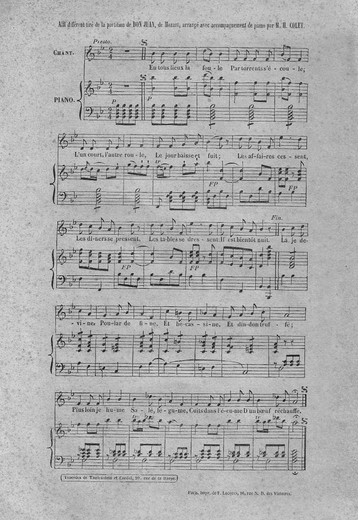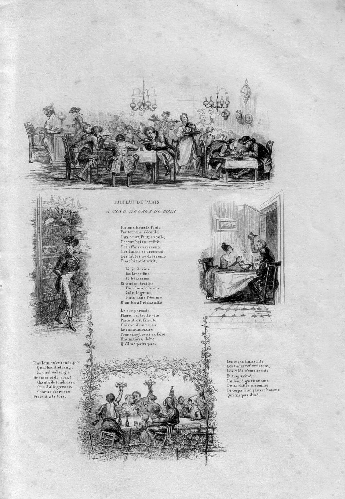 En tous lieux la foule Par torrents s’écoule ; L’un court, l’autre roule ; Le jour baisse et fuit, Les affaires cessent ; Les dîners se pressent, Les tables se dressent ; Il est bientôt nuit. Là, je devine Poularde fine, Et bécassine, Et dindon truffé ; Plus loin je hume Salé, légume, Cuits dans l’écume D’un bœuf réchauffé. Le sec parasite Flaire… et trotte vite Partout où l’invite L’odeur d’un repas ; Le surnuméraire Pour vingt sous va faire Une maigre chère Qu’il ne paiera pas. Plus loin qu’entends-je ? Quel bruit étrange Et quel mélange De tons et de voix ! Chants de tendresse, Cris d’allégresse, Chorus d’ivresse Partent à la fois. Les repas finissent ; Les teints refleurissent ; Les cafés s’emplissent ; Et trop aviné, Un lourd gastronome De sa chûte assomme Le corps d’un pauvre homme Qui n’a pas dîné. |