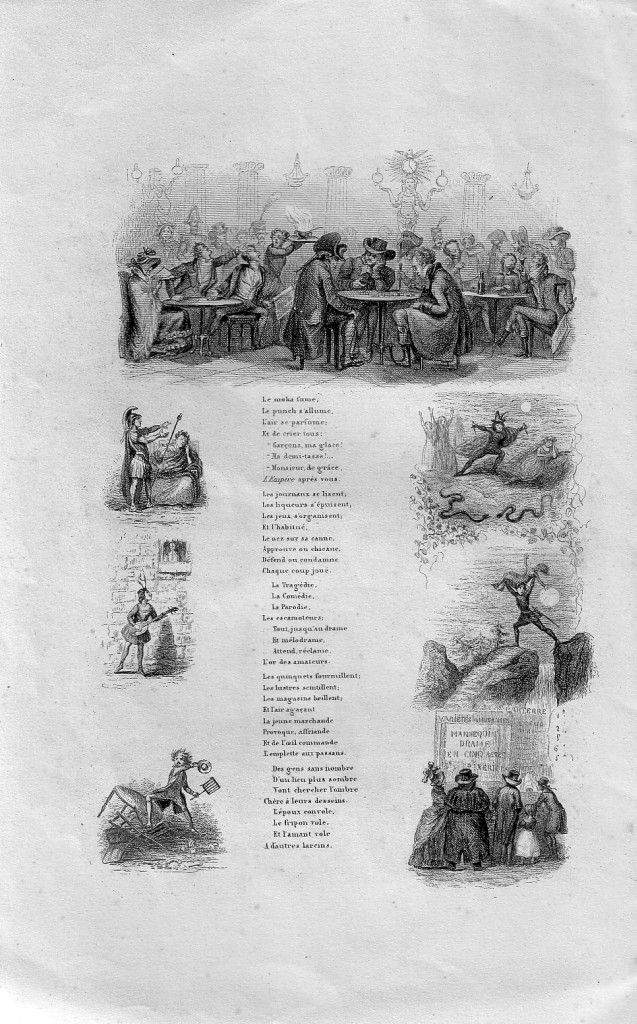 Le moka fume, Le punch s’allume, L’air se parfume ; Et de crier tous : « Garçons, ma glace ! - Ma demi-tasse !... - Monsieur, de grâce, L’Empire après vous. » Les journaux se lisent ; Les liqueurs s’épuisent, Les jeux s’organisent ; Et l’habitué, Le nez sur sa canne, Approuve ou chicane, Défend ou condamne Chaque coup joué. La Tragédie, La Comédie, La Parodie, Les escamoteurs ; Tout, jusqu’au drame Et mélodrame, Attend, réclame L’or des amateurs. Les quinquets fourmillent ; Les lustres scintillent ; Les magasins brillent ; Et l’air agaçant La jeune marchande Provoque, affriande Et de l’œil commande L’emplette au passans. Des gens sans nombre D’un lieu plus smbre Vont chercher l’ombre Chère à leurs desseins. L’époux convole, Le fripon vole, Et l’amant vole A d’autres larcins. |