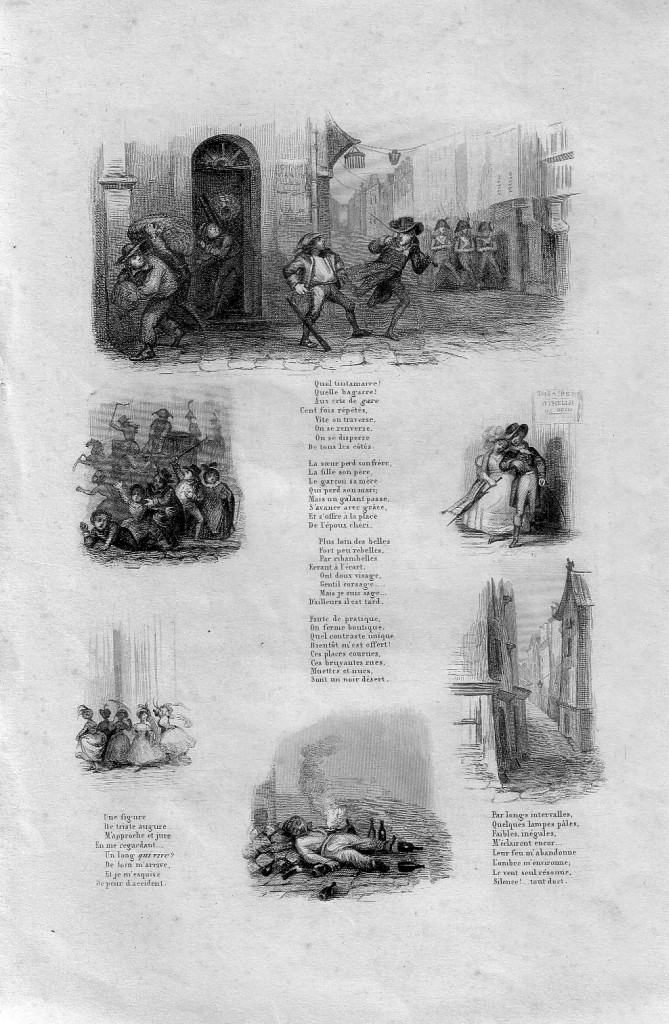Quel tintamarre ! Quelle bagarre ! Aux cris de gare Cent fois répétés, Vite on traverse, On se renverse, On se disperse De tous les côtés. La sœur perd son frère, La fille son père, Le garçon sa mère Qui perd son mari ; Mais un galant passe, S’avance avec grâce, Et s’offre à la place De l’époux chéri. Plus loin des belles Fort peu rebelles, Par ribambelles Errant à l’écart, Ont doux visage, Gentil corsage… Mais je suis sage… D’ailleurs il est tard. Faute de pratique, On ferme boutique, Quel contraste unique Bientôt m’est offert ! Ces places courues, Ces bruyantes rues, Muettes et nues, Sont un noir désert. Une figure De triste augure M’approche et jure En me regardant… Un long qui vive ? De loin m’arrive, Et je m’esquive De peur d’accident. Par longs intervalles, Quelques lampes pâles, Faibles, inégales, M’éclairent encor… Leur feu m’abandonne L’ombre m’environne ; Le vent seul résonne, Silence !... tout dort. |
