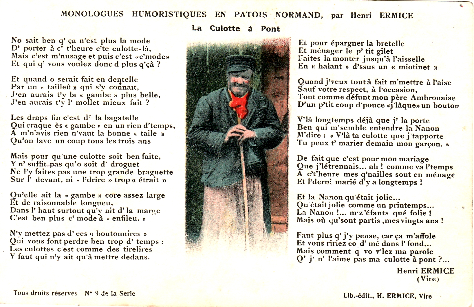 D' porter à c' t'heure c'te culotte-là, Mais c'est m'nusage et puis c'est « c'mode » Et qui q' vous voulez donc d plus q'çà ? Et quand o serait fait en dentelle Par un « tailleû » qui s'y connait, J'en aurais t'y la « gambe » plus belle, J'en aurais t'y l' mollet mieux fait ? Les draps fin c'est d' la bagatelle Qui craque ès « gambe » , en un rien d'temps, A m'n'avis rien n'vaut la bonne « taile » Qu'on lave un coup tous les trois ans Mais pour qu'une culotte soit ben faite, Y n' suffit pas qu'o soit d' droguet Ne l'y faites pas une trop grande braguette Sur l' devant, ni « l'drire » trop « étrait » Qu'elle ait la « gambe » core assez large Et de raisonnable longueu, Dans l'haut surtout qu'y ait d' la marge C'est ben plus c' mode à « enfileu. » N'y mettez pas d' ces « boutonnires » Qui vous font perdre ben trop d' temps Les culottes c'est comme des tirelires Y faut qui n'y ait qu'à mettre dedans. Et pour épargner la bretelle Et ménager le p' tit gilet Faites la monter jusqu'à l'aisselle En « halant » d'ssus un « miotinet » Quand j'veux tout à fait m'mettre à l'aise Sauf votre respect, à l'occasion, Tout comme défunt mon père Ambrouaise D'un p'tit coup d'pouce « j'lâque » un bouton V'là longtemps déjà que j' la porte Ben qui m'semble entendre la Nanon M'dire : « V'là ta culotte que j'tapporte Tu peux t' marier demain mon garçon. » De fait que c'est pour mon mariage Que j'létrennais... ah ! comme va l'temps A c't'heure mes q'nailles sont en ménage Et l'derni marié d'y a longtemps Et la Nanon qu'était jolie... Qu'était jolie comme un printemps... La Nanon !... m' z'éfants qué folie ! Mais où qu'sont partis mes vingts ans ! Faut plus q'j'y pense, car ça m'affole Et vous ririez co d' mé dans l' fond... Mais comment q vo v'lez ma parole Q' j' n'l'aime pas ma culotte à pont (texte